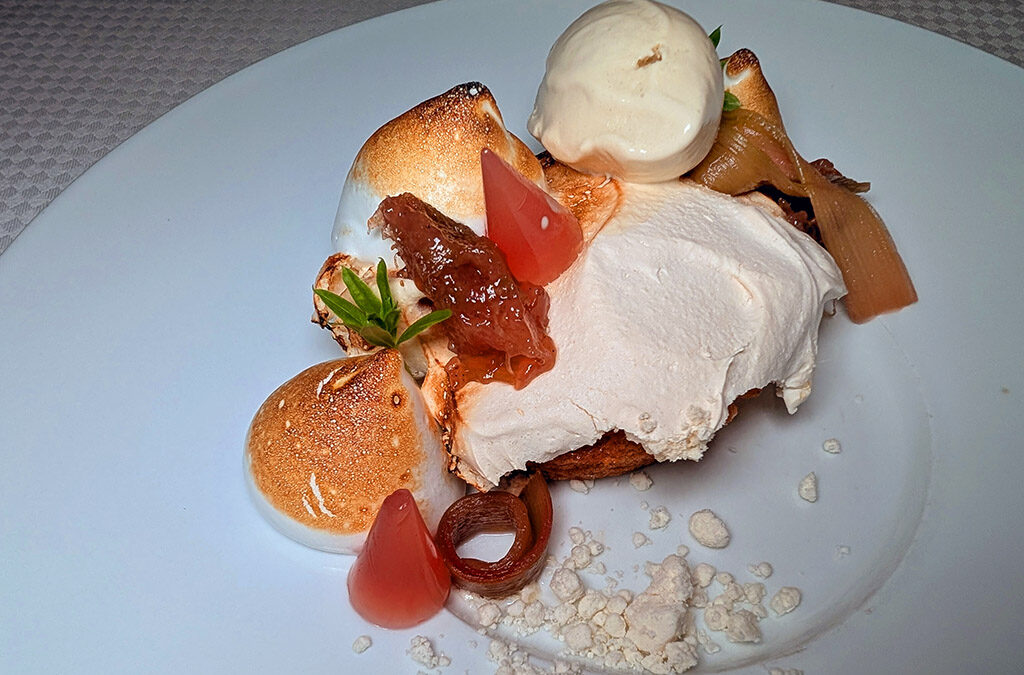 Ein liebevoll gebackener, runder Rhabarber-Baiser-Kuchen entführt in Kindheitserinnerungen. Die geflämmten Baisertuffs glänzen goldbraun und knusprig, während der säuerliche Rhabarber mit Rhabarbermarmelade, frischen Rhabarberschleifen und einem zarten Rhabarbergeleekegel für vielschichtige Fruchtigkeit sorgt. Das erfrischende Waldmeister-Eis bringt eine aromatische Leichtigkeit ins Spiel, unterstützt von einem Hauch Waldmeister-Malto, das dem Dessert eine dezente Süße verleiht. Ein süffiger Begleiter ist der 2022 Brachetto d’Acqui von Braida di Giacomo Bologna aus dem Piemont – prickelnd, fruchtig und mit feiner Frische, der das Menü harmonisch abrundet. Einfach klasse!