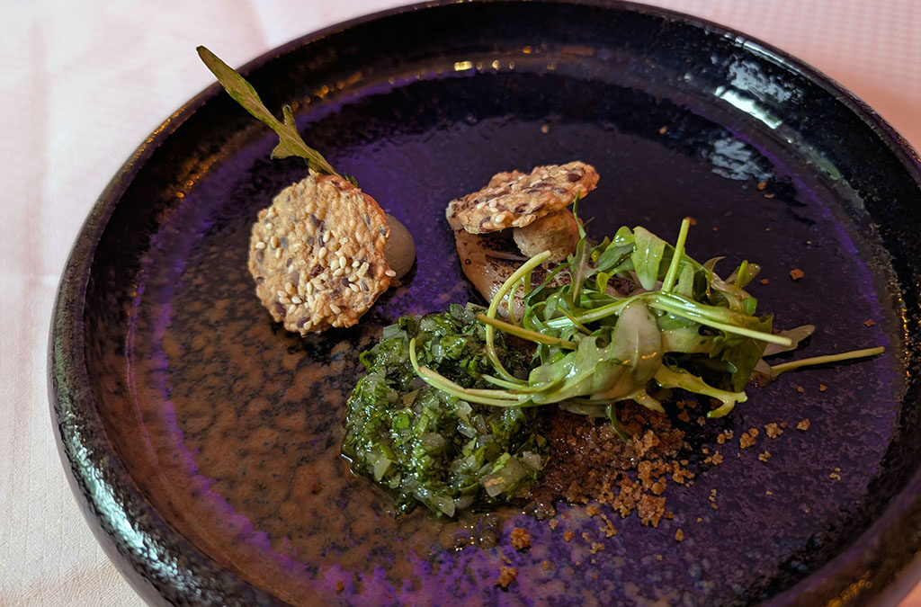 Ein Gericht, das Tradition mit feiner Handwerkskunst verbindet: Das Makrelenfilet wird in einer fruchtigen Beize zart mariniert und anschließend sanft geflämmt – die Haut bleibt bewusst außen vor, um die pure Struktur des Fisches zu betonen. Begleitet wird die aromatische Makrele von Rucola in verschiedenen Texturen: frisch mariniert, frittiert und als knackiger Kontrapunkt zur cremigen Brotkomponente. Die Vinaigrette aus Feigensenf verleiht dem Gericht eine feine Süße und pikante Tiefe, unterstützt vom klaren Biss des Sesam-Roggen-Knäckebrots.