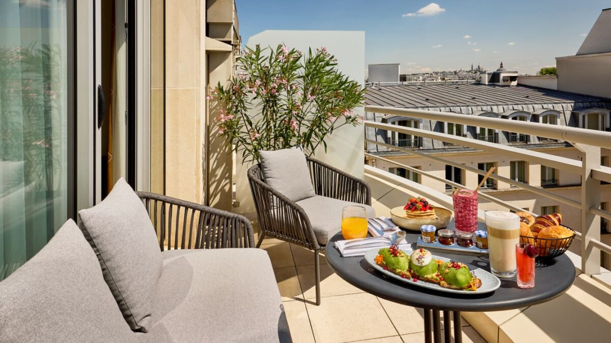 Im hinteren Teil des Hotels befindet sich der Frühstücks- und Restaurantbereich. Sehr schön ist es hier im Sommer, da fern des Verkehrs der Champs-Élysées die Stille eines Terrassenbereichs in völliger Abgeschiedenheit genutzt wird. Da sich gerade einige Suiten auf der dem Boulevard zugewandten Seite befinden, könnte man meinen, der Straßenlärm störe die Ruhe im Hotelzimmer. Dem ist allerdings nicht so, dreifach verglaste Fenster und Balkontüren sorgen für absolute Ruhe.