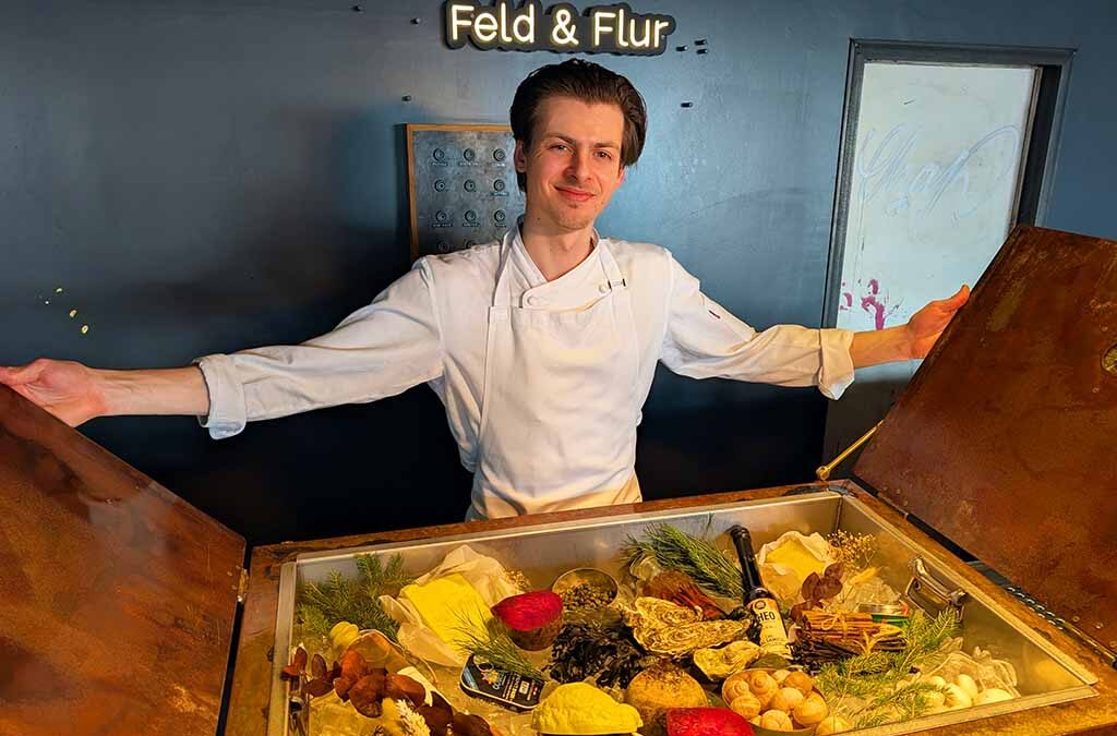 „In der Einfachheit steckt die Komplexität“, zum Auftakt von „Feld & Flur 2026“ setzt das Gastronomenpaar Thomas A. Imbusch und Sophie Lehmann auf Reduktion mit Tiefe. Nach einem feinperligen Rosé-Schaumwein von Ziereisen geben an der Showbar die kunstvoll arrangierten Zutaten einen Vorgeschmack aufs Menü. Dazu ein erster Bissen – Schmorfleisch, Senfcreme und Zwiebel – ein Happen Schlachtfest, kraftvoll, aromatisch, ein Gruß, der sofort Lust auf mehr macht.