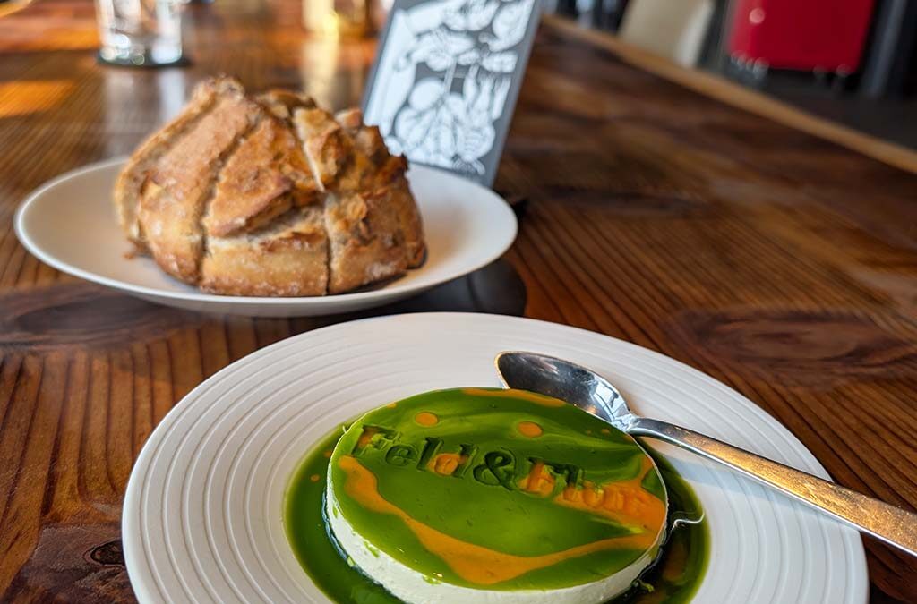 Zurück am großen Holztisch beginnt das Speisevergnügen mit einer Reihe feiner Amuse Bouches. Ein kleines Quintett der Geschmacksrichtungen: Fenchel bringt Süße, Tomate lebendige Säure, Pilze salzige Tiefe, Radicchio eine elegante Bitterkeit, Käse schließlich Umami. Dazu kommt noch warmes Sauerteigbrot mit aromatischer Joghurtbutter, verfeinert mit Rosmarin, Schnittlauch und einem Hauch Chili.