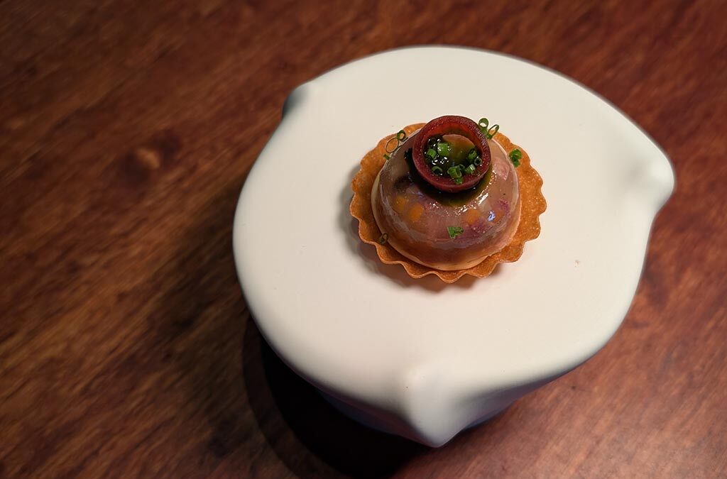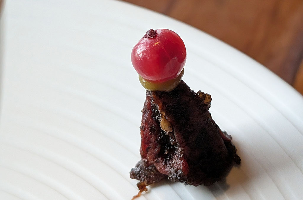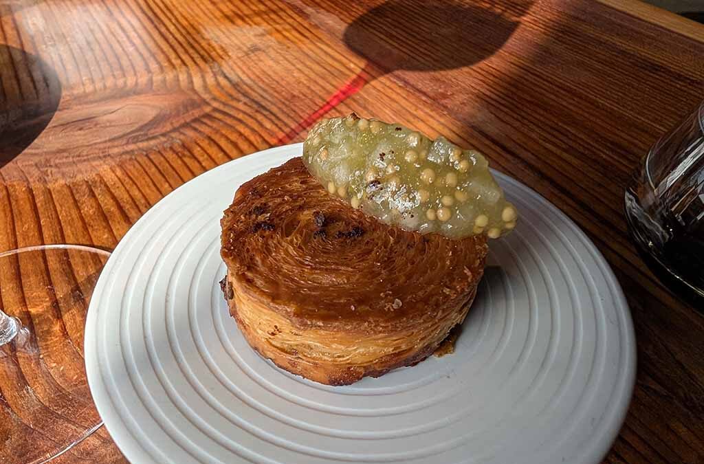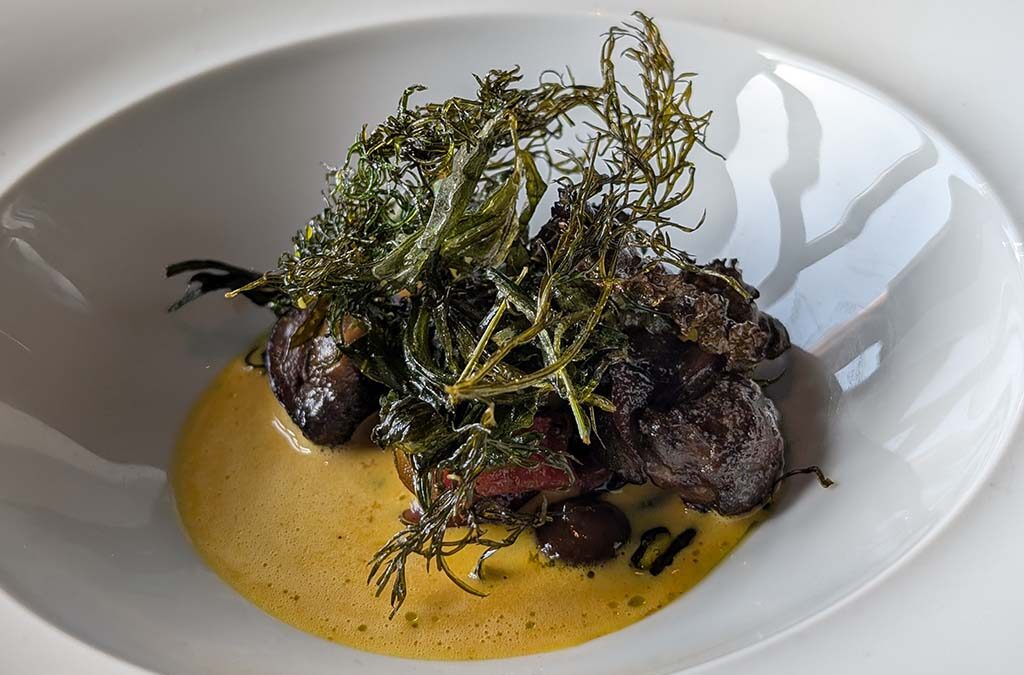 Zart geschmortes und gegrilltes Rind auf Pfefferrahmsauce – Schulter und Patty werden begleitet von Rettichtalern, Wildkräutern, roten Zwiebeln und Pilztee, dazu knusprige Sauerteigbrioche und etwas Gurkenmarmelade. Ein Gericht, das Kraft und Eleganz vereint. Dazu der Reserve Ventoux 2022 der Domaine de Faverand: eine Grenache-dominierte Cuvée mit Carignan, voll von roten Früchten, Gewürzen und Lakritz, rund und harmonisch am Gaumen.