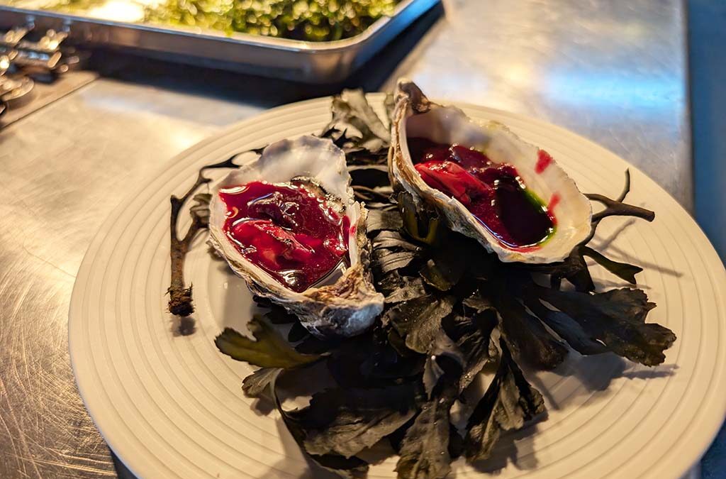 Der erste Gang – Forelle, Rote Bete und Auster – zeigt bereits die Handschrift der Küche: klar, präzise und voller Spannung. Begleitet wird er von einem gereiften Sake der Berliner Manufaktur Reigen Fermentation – cremig, mit Noten von getrockneter Aprikose, feinem Holz und einem sanft oxidativen Charakter.