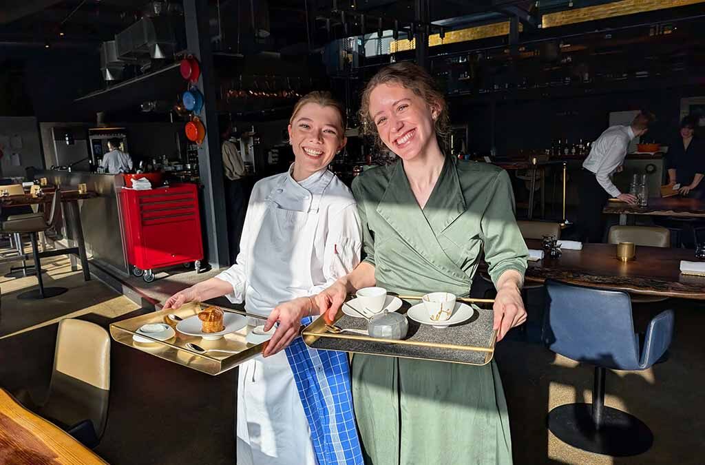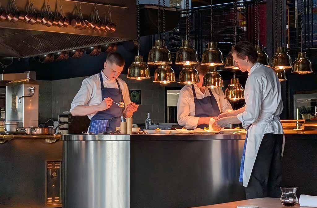 Der Raum wirkt großzügig und offen. Durch hohe Fenster fällt der Blick auf die Elbbrücken, während im Inneren eine Atmosphäre entsteht, die Industrial Chic mit Wärme verbindet. Massive Holztische, schwer und einladend, geben dem Raum Erdung. Hier darf man ankommen, sich Zeit nehmen, genießen. Im Zentrum des Geschehens: die offene Küche des Restaurants 100/200, ausgezeichnet mit zwei Michelin-Sternen. Gäste erleben hier Menüs nach dem Carte-blanche-Prinzip – eine kulinarische Reise, bei der das Küchenteam die Dramaturgie bestimmt. Überraschung, Neugier und die pure Freude am Essen stehen im Mittelpunkt.