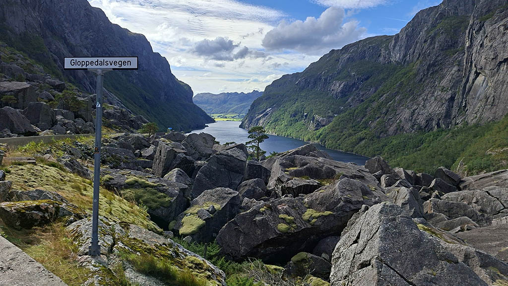 Nicht weit entfernt beginnt die Gloppedalsvegen-Route. Berge, Felsen, Licht und Wasser verschmelzen zu einem Panorama, das fast wie inszeniert wirkt. Kein Wunder, dass die Straße als „Scenic Road“ gefeiert wird: Jeder Fotostopp eröffnet neue Blickwinkel, die sich wie gemalt anfühlen. Die riesigen Steine und die dramatische Topographie machen Gloppedalsura zu einem surrealen Naturerlebnis – wie eine Natur, die in Zeitlupe explodiert und erstarrt ist. Für alle, die Geologie sehen, fühlen und begehen wollen: perfekt.