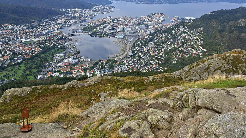 Vom Ulriken, einem der sieben Berge, eröffnet sich ein Panoramablick auf rote Dächer, alte Holzhäuser und schmale Gassen – per Seilbahn in 8 Minuten oder nach einer 1,5 bis 3-stündigen Wanderung erreichbar.