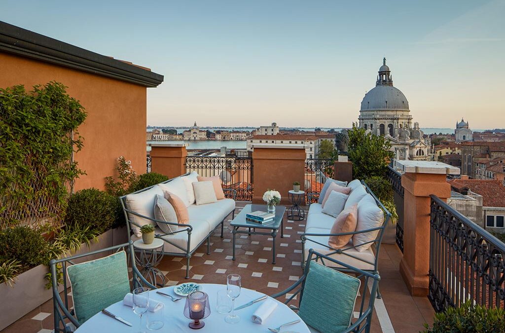 Das Interieur der Suite verbindet modernes Design mit der Frische eines venezianischen Gartens und zeichnet sich durch zarte Pastelltöne und eine geräumige, möblierte zweistöckige Außenterrasse aus. Im Außenbereich verfügt die möblierte, zweistöckige Gartenterrasse über eine Lounge-Garnitur und einen Esstisch für bis zu vier Personen und eignet sich für private Cocktailempfänge mit bis zu 40 Gästen oder Bankette mit 30 Sitzplätzen.