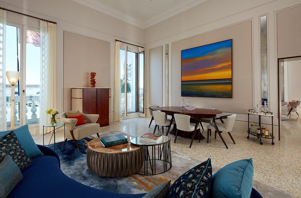 Die Venetian Suites sind alle in den warmen Farbtönen der Dämmerung gehalten und verfügen über handgefertigte moderne Designdetails, die ebenfalls vom künstlerischen Erbe der Stadt inspiriert sind. Die Monet-Suiten sind eine Hommage an die Lichtreflexionen auf dem Canal Grande, wo eine Reihe zeitgenössischer Gemälde des Künstlers Olivier Masmonteil Monets Meisterschaft bei der Einfangung des einzigartigen Lichts Venedigs feiern. Die größte aller Monet-Suiten, die Präsidentensuite, befindet sich im zweiten Stockwerk des Badoer Tiepolo-Palastes und verfügt über zwei Schlafzimmer und einen Panoramablick auf den Canale Grande.