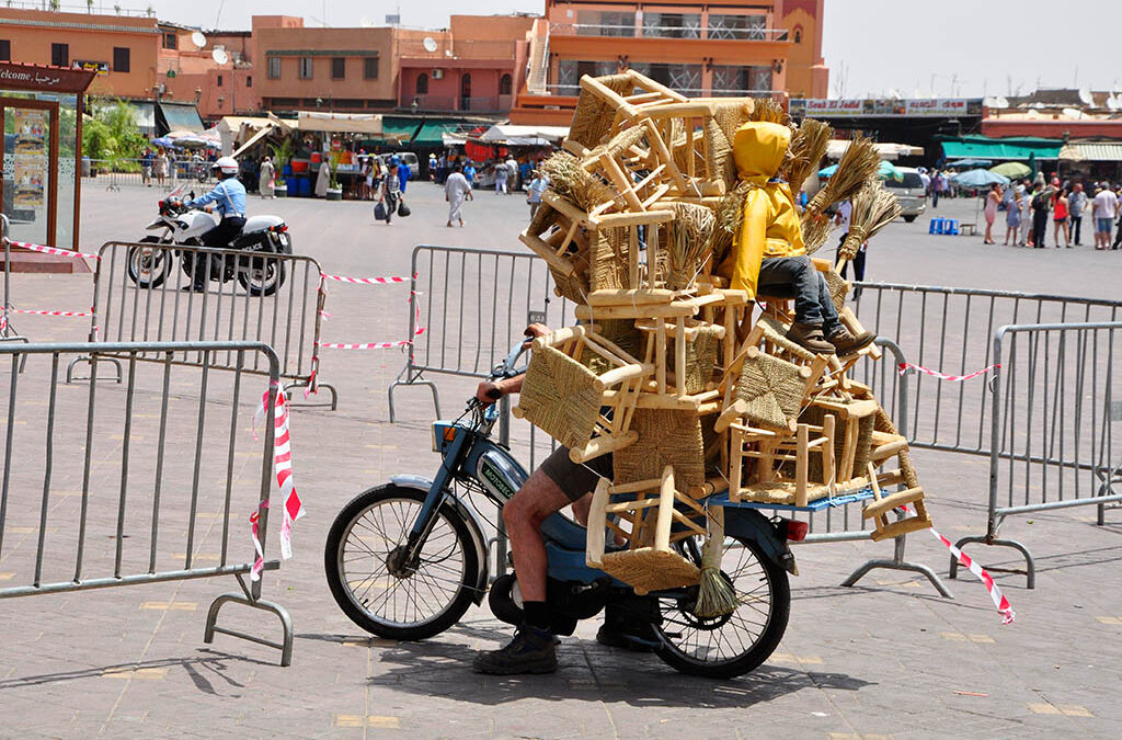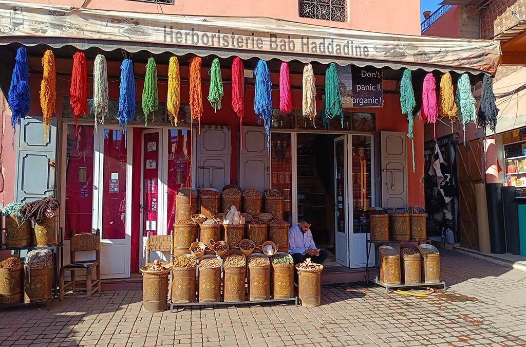 Schmiedeeiserne Kunst und das laute Hämmern auf das Metall einerseits, der Geruch von Stahl liegt in der Luft; Handtaschen und Jacken aus Leder, das gegerbte Material verströmt seine klassische Ausdünstung; Süßwarenhändler mit bunt-klebrigen Auslagen liefern das Aroma von Zucker und orientalischen Gewürzen: ein Gang durch die Souks ist auch ein Gang durch die verschiedensten Sinneserfahrungen. Es sollen vermeintlich 35.000 Geschäfte sein, die in der Medina meist bis Mitternacht ihre Ware feilbieten. Es ist ein Balanceakt, hier nicht alle paar Meter durch interessiertes Schauen auf die Produkte angesprochen zu werden, und verlockt zu sein, sich nicht doch alles genau anzuschauen.