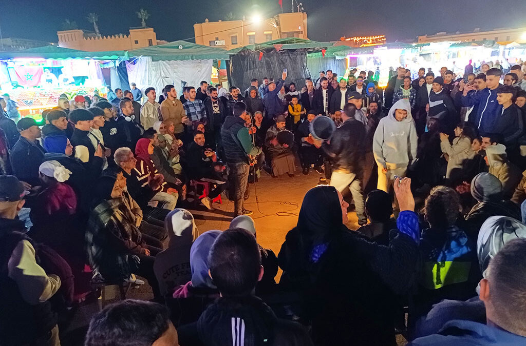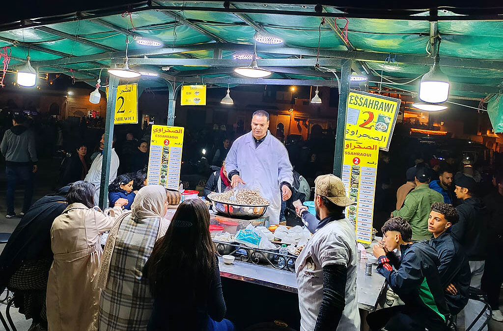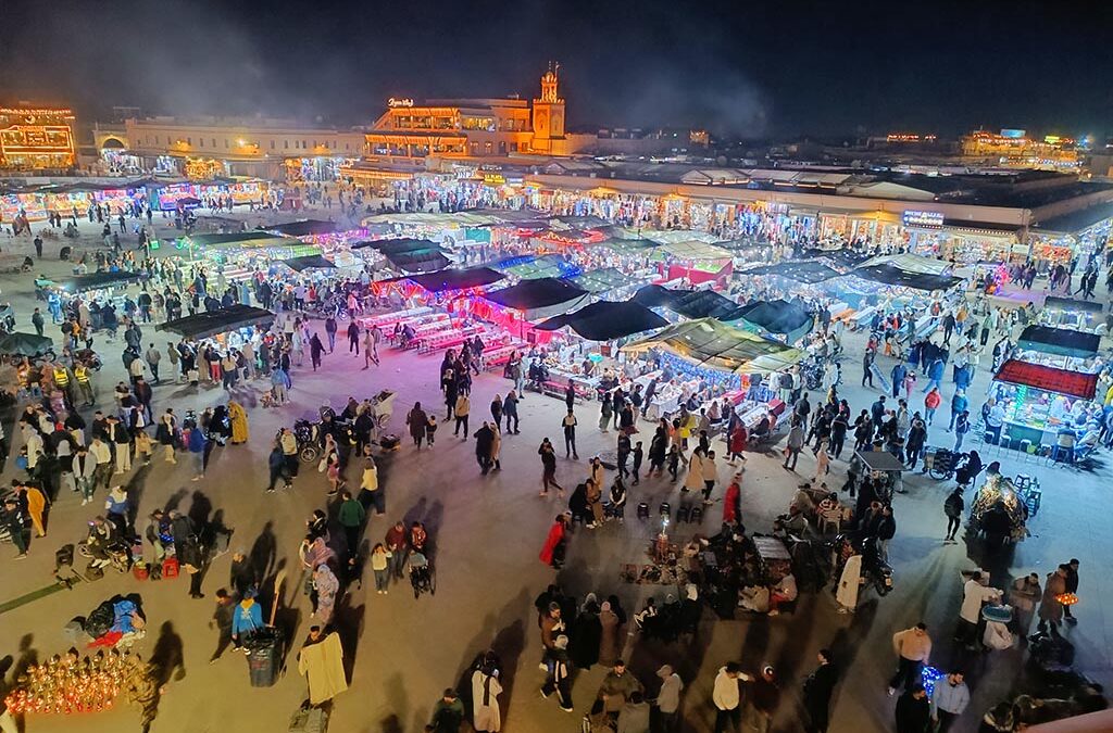 Nur wenige Meter von Hassans Geschäft entfernt, zwei Gassen passierend und vorbei an ein oder zwei Restaurants, kommt man auf die eigentliche Attraktion Marrakeschs: auf den Marktplatz Djemaa el Fna. Tagsüber ein Betonplatz von riesigen Ausmaßen, verlassen und in der Sonne wartend auf den Abend, kommt mit der untergehenden Sonne das Leben auf den Platz, so wie an keinem anderen Ort Marrakeschs. Hunderte Händler mit Getränkeständen, kleinere Street-Food-Restaurants und Henna-Künstler machen den Platz dann zu einem wahrhaft orientalischen Wirrwarr der Eindrücke. Durchaus der eine oder andere Schlangenbeschwörer ist dabei, auch Geschichtenerzähler findet man hier.