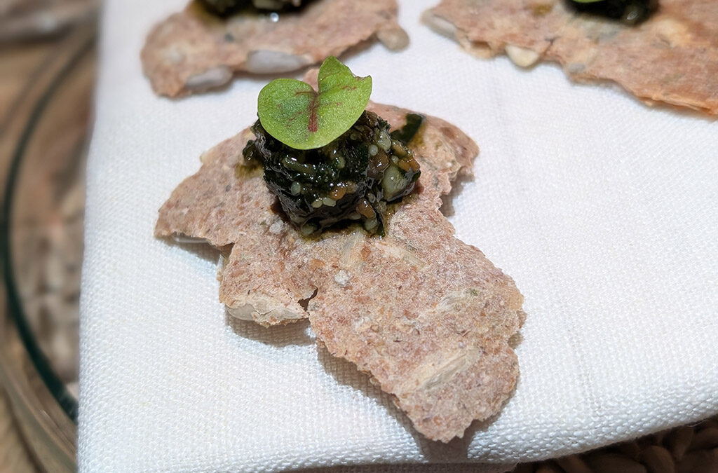 Als Einstieg serviert das Team ein Feigenblattgranité mit Zitronenverbene, aufgegossen mit Winzersekt vom Weingut im Zwölberich – aromatisch, leicht, und doch von erstaunlicher Tiefe. Dazu werden kleine Apéros serviert – Rheinkiesel mit einer feinen Tomatenbutter aus getrockneten Eifler-Tomaten, Sauerteigbrot mit Sonnenblumenkernen und knusprige Croquetas. Eine Miniaturreise durch Texturen und Aromen, die den Gaumen sanft auf das Menü einstimmt.