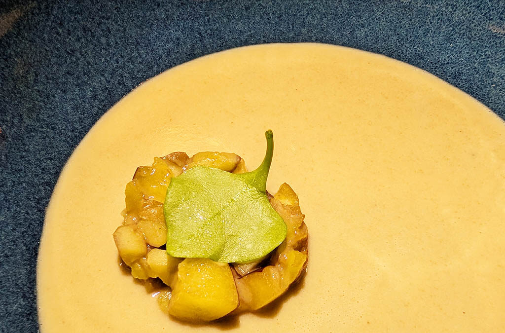Das Menü startet mit einem Hauch von Herbst auf dem Teller: Die samtige Maronensuppe entfaltet ihr nussiges Aroma, während frischer Portulak und die feine Süße von Pflaume für lebendige Kontraste sorgen. Dazu wird ein 2024 Grauburgunder vom Weingut Rings in Freinsheim gereicht – ein Wein mit klarer Struktur, zarter Frucht und eleganter Balance. Was zunächst klassisch klingt, offenbart im Glas eine überraschend unkonventionelle Seite: Zu 80 Prozent im Edelstahltank ausgebaut, bewahrt er seine frische, kernobstartige Klarheit. Der anschließende Ausbau im französischen Barrique verleiht ihm zugleich Tiefe, Struktur und einen Hauch von Vanille. So trifft Pfälzer Mineralik auf feine Holzwärme – eine Verbindung, die perfekt mit der erdigen Eleganz der Marone harmoniert. der den Gang harmonisch vollendet.