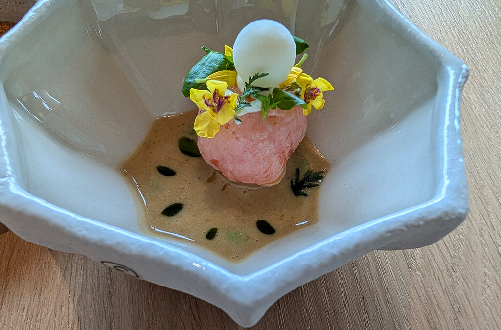 Im Kräuterreich beginnt das Menü mit „Goldene Zeiten“ – einem duftenden Tee aus Leoganger Safran und Löwenzahn – ein leiser Einstieg voller Tiefe. Es folgen als Auftakt zu den Höhenlagen sommerliche Apero-Happen, die kunstvoll inszenierten Gängen gleichen: Karottenraritäten aus dem Rübenfeld (Mohn-Miso, Wilde Möhre, Ingwer-Karotten-Gel), das Perlenspiel mit Lachsforelle, Erbsen, Buttermilch, Radieschen, Mädesüß und der essbare Stein (vom Gipfel) mit Gamstatar und Preiselbeer-Flechtenschaum und isländischem Moos. Dazu: Sauerteigstangerl mit Kartoffel und Kräuterbutter, die wie eine farbenfrohe, blühende Sommerwiese gestaltet ist. Eine ausgezeichnete Weinbegleitung wird zum Menü von Sommelier Fabian Klinger serviert.