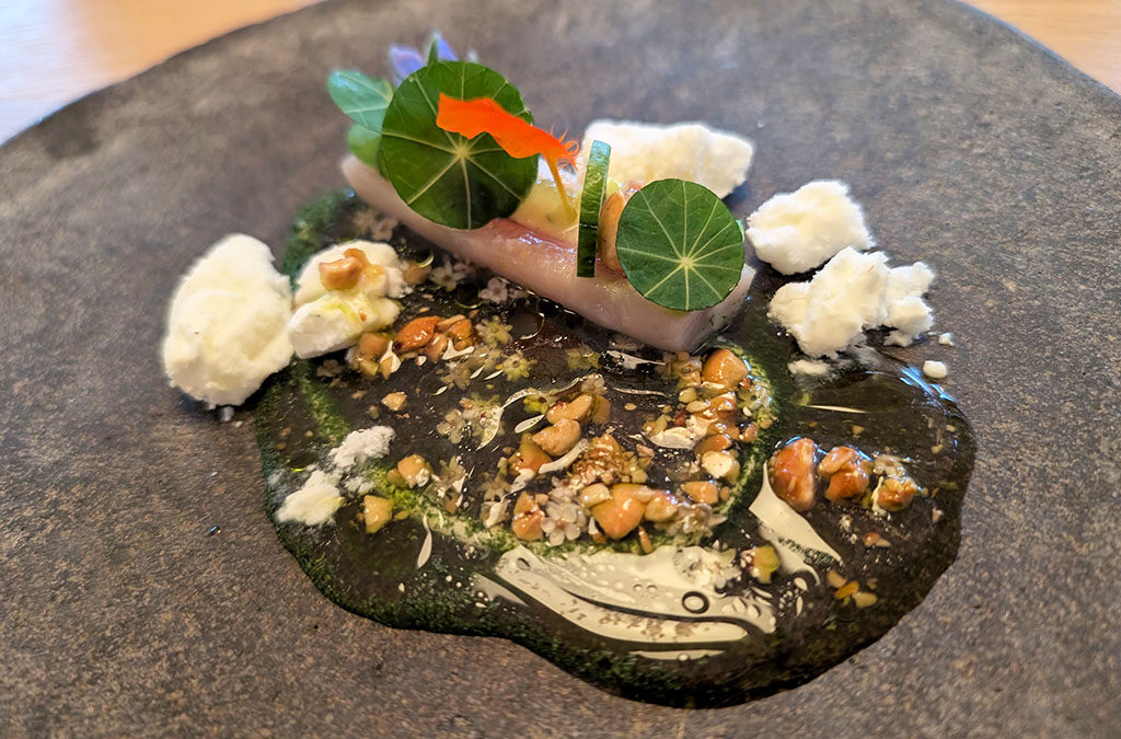 Zwischen 500 und 1.000 Metern Höhe liegt die Quelle einer ganz besonderen Erinnerung von Vitus Winkler: die einfache Hütte am Tümpel, zu der er mit Vater und Bruder immer wieder aufstieg. Dort, in der frischen Bergluft, schien eine kleine Pfütze auf 1.800 Metern wie ein weites Meer voller Fantasie – mit Seglern, Piraten und tropischen Stränden. Dieses Wechselspiel aus Realität und Traum spiegelt sich in der „Bachlandschaft“ wider: pochierte Bachforelle trifft auf vielfältige Gurkentexturen, Bauernjoghurt, Haselnuss und Borretsch in all ihren Facetten – als duftender, frischer Gruß aus der alpinen Höhenlage und der Kindheit zugleich.